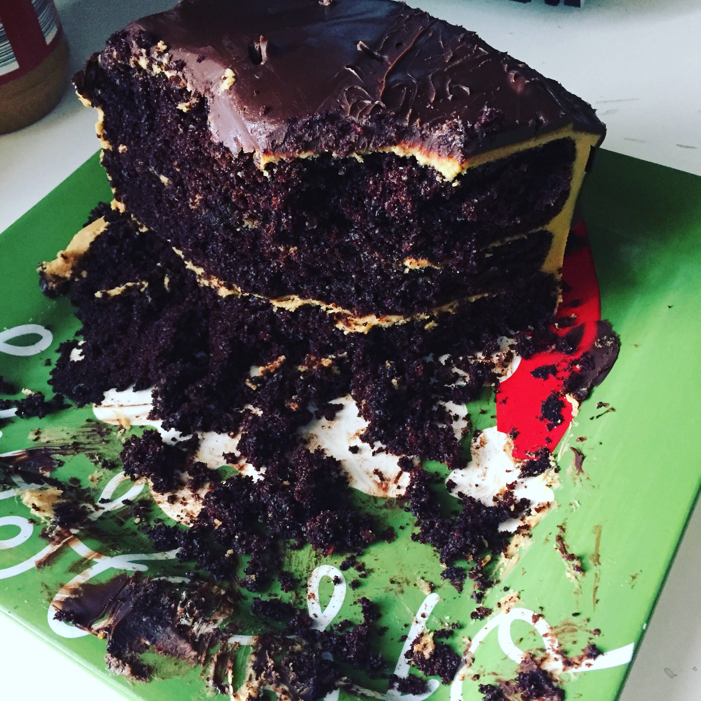 Last night we went to a friend’s house for a Christmas party. We brought dessert. We also brought a large portion home because SO. MUCH. FOOD. Sadly, I didn’t take a before photo, but please know that I say this in the most humble manner possible: I completely nailed this one. Chocolate cake, peanut butter frosting and chocolate ganache topping. So. GOOD.