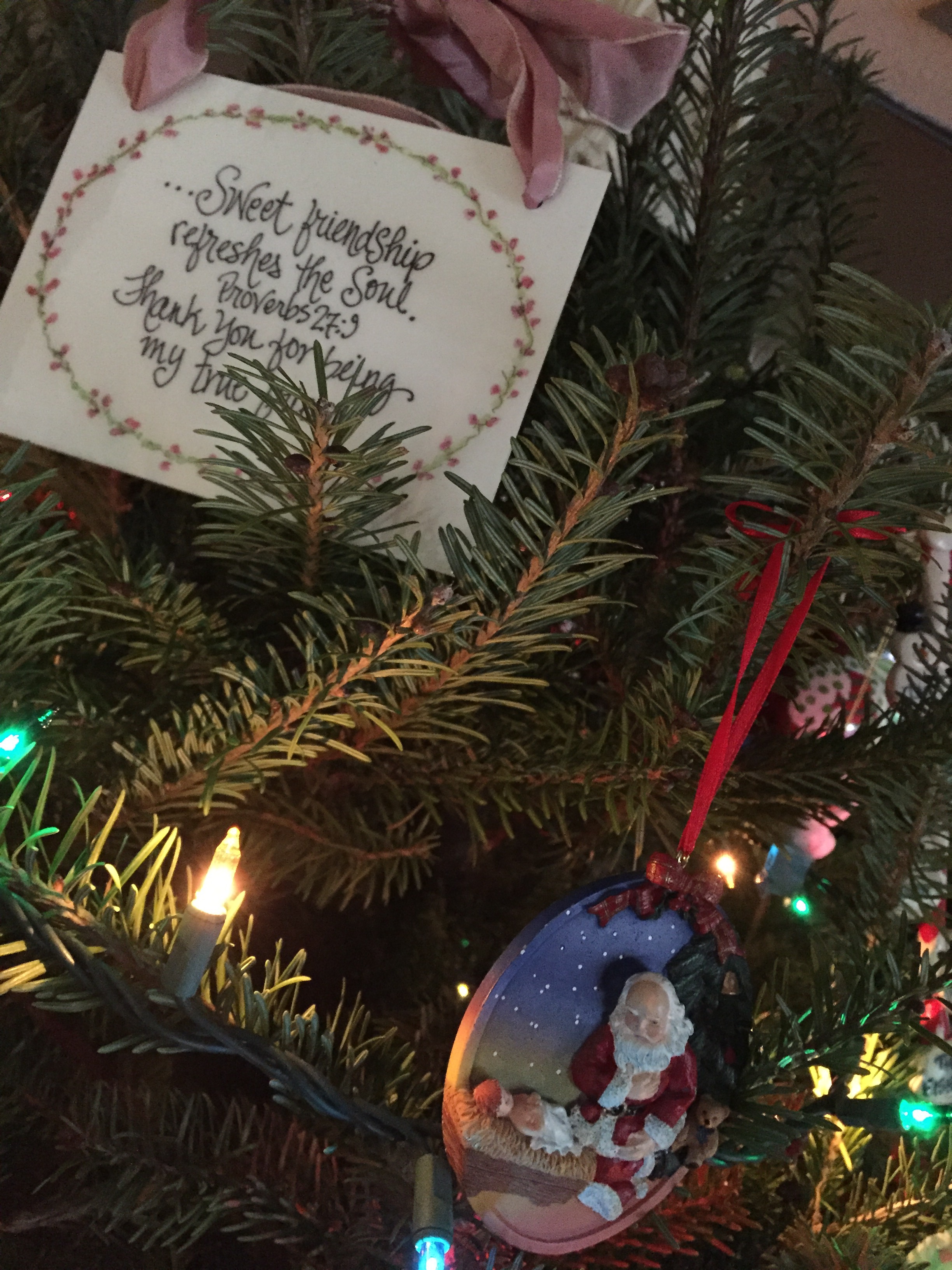 We also put the ornaments on the tree. It’s been up since Thanksgiving weekend with only the lights and the angel and one lone ornament and it’s been nice and simple and we’ve fully enjoyed it. But it’s always fun to put the ornaments on and go through them, each one bringing back memories and seasons. The girls put them on, I only repositioned a couple and rescued one from the dog.