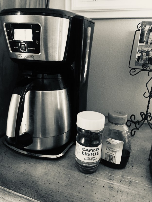 The coffee pot is for my a.m. crew and I reheat it when I wake up, but the BUSTELO…..that is my 5 a.m. hit mixed with almond milk and honey. YES, SIR!!! All the wide eyes and bushy tails to carry me through the end of my shift.