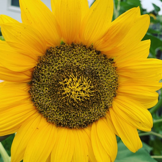 Our oldest daughter had a hankering for sunflowers so she and Hubs planted two rows at the beginning of the summer and man, oh,  man do we have some beauties to behold.  I am torn between cutting them and putting them into vases or just leaving them there to enjoy.  We have done the latter.  For now.