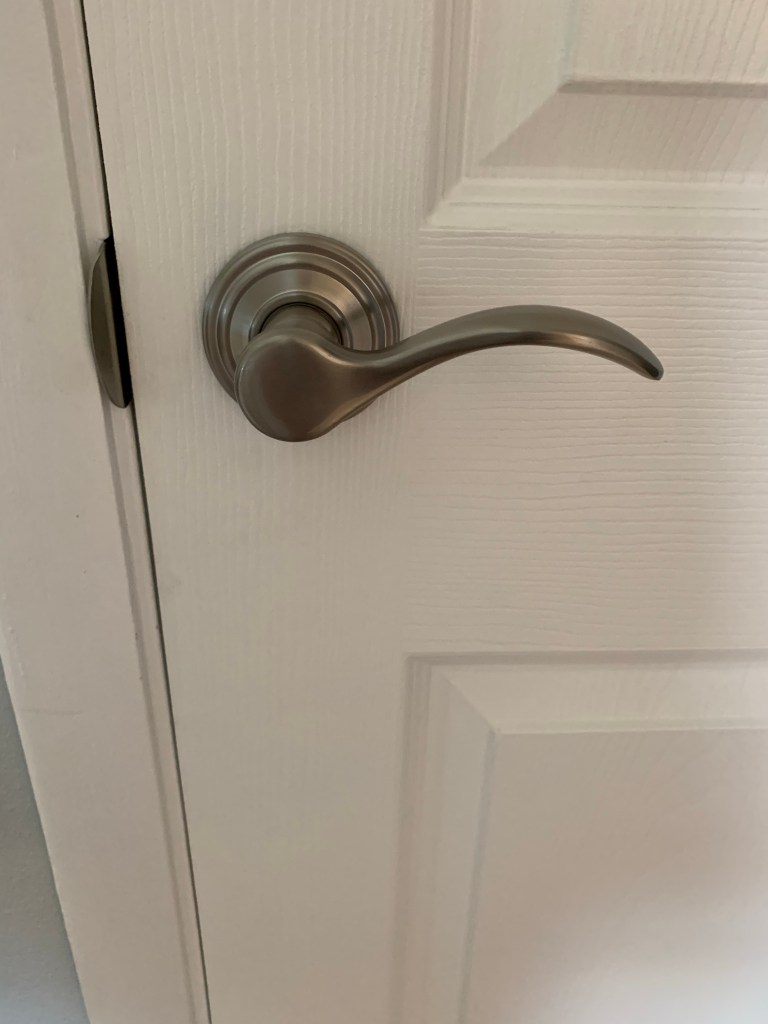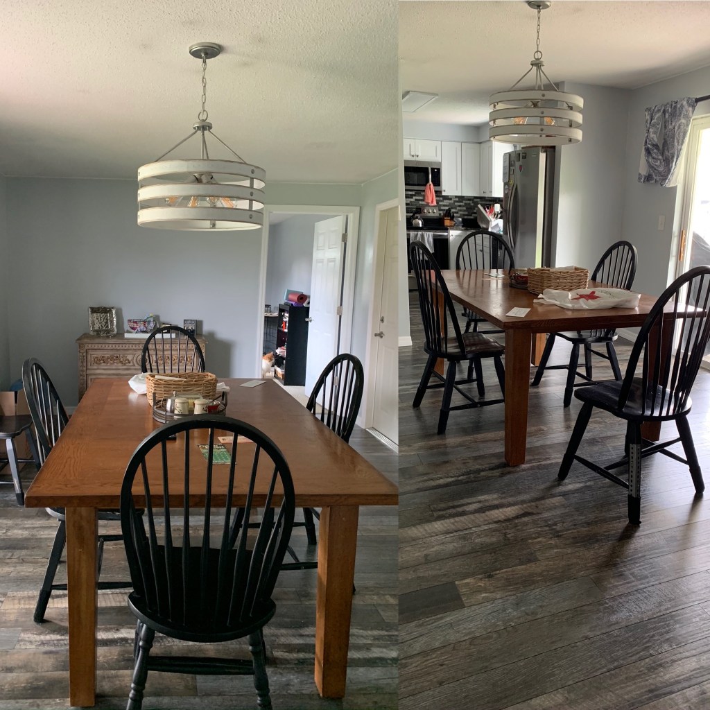 Before. Our flooring was able to go right over the tile with a transitional concrete. That saved us some dust! Old and new paint…..from golds and greens to greys and blues. We also replaced all the interior doors in the house.New doors and hardware. Doors close fully and teenage skate stickers artfully covering inside and outside of doors are no longer. This is also important in that our cat can no longer “knock” on our door at 2 a.m.—-if he does, we don’t hear him!My buffet table now has a new home and we have room to stretch out. Hubby hated the old light so we swapped it out for a new light with LED and dimmable option. the kitchen also has an LED light that replaced our old fluorescent light—you can just barely see it on the right—-it also has a dimmer. It was an option I didn’t realize we had—our electrician told us about it and I’m glad we went in that direction.
