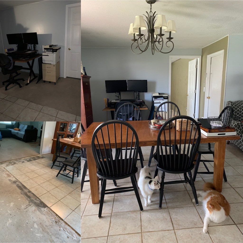 From spare room/guest cat room, to emptying out and therapeutic peeling of random wallpaperwith paneling down we were able to insulate and put up dry wall in the entire room, leaving fresh walls to paint and paint and paintA quiet spot to have coffee in the morning and Bandit’s new spot—-poor dude, his crate was moved so many times during the construction process over the past 2 1/2 months, he kept returning to his original spot in the living room and just standing there. He’s got it now, though!Command central and the best thing is a DOOR for those loud conference calls! Our cat enjoys this new space as well.