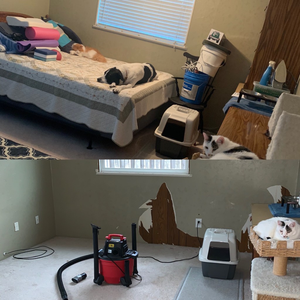 Hubby’s home office was on the opposite side of bedroom wall sharing the dining room. It worked. When our oldest son moved out, we then had a spare room with plans to move the home office, however, we had paneling over the block walls and one of the walls wasn’t properly insulated, so we had some work to do first. Of course.