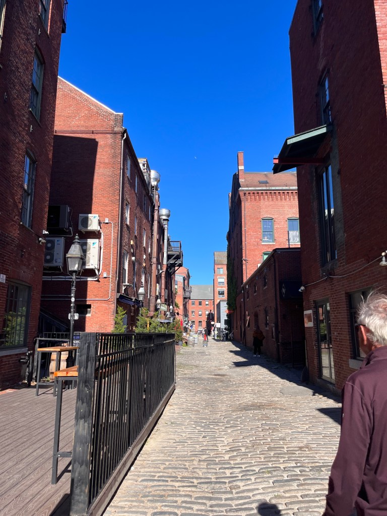The downtown section of Portland was a great spot to stretch our legs after lunch and sightseeing. Main Street pier, Old Port, cobblestone alleys leading to shops, restaurants and bars. Had to do a little shopping—a few kitchen items at Leroux and a coffee mug and magnet—restrained shopping. But we did drool a bit over the bags at Sea Bags and may have to revisit them for a Christmas gift or two. Old sails turned into bags of all shapes, sizes. They are pricey and we have a lot of bags, soooooooooooooo. We’ll see.