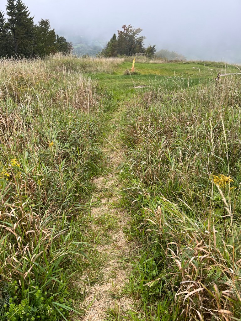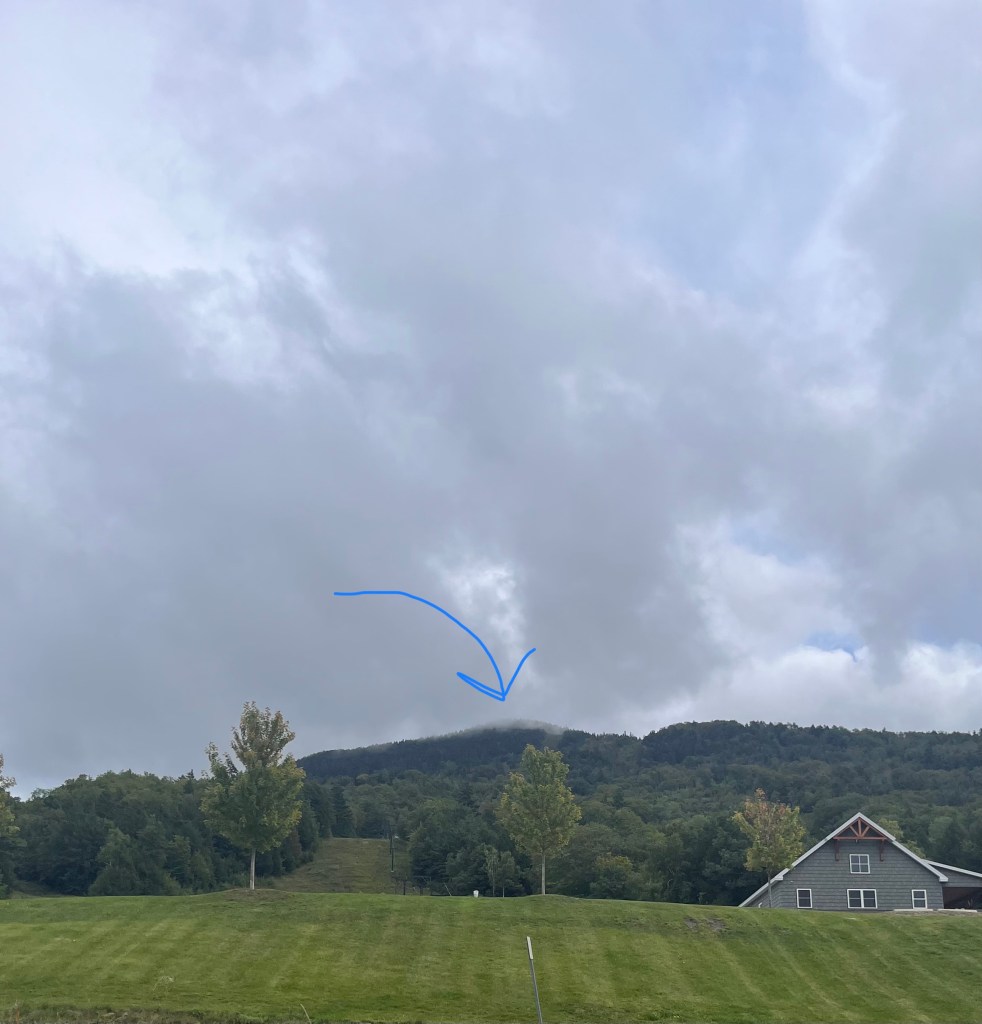 With the cloud cover, also came intermittent fog and the higher we went, we entered the clouds. One of the lookouts nearing the summit housed an old ski patrol building and a great view of the town below between the clouds. We determined from the map we had about 800-1000 feet to summit which would take approximately 45 min +/- based on our progress and couldn’t guarantee a view with the weather once we reached the top. So we called it.