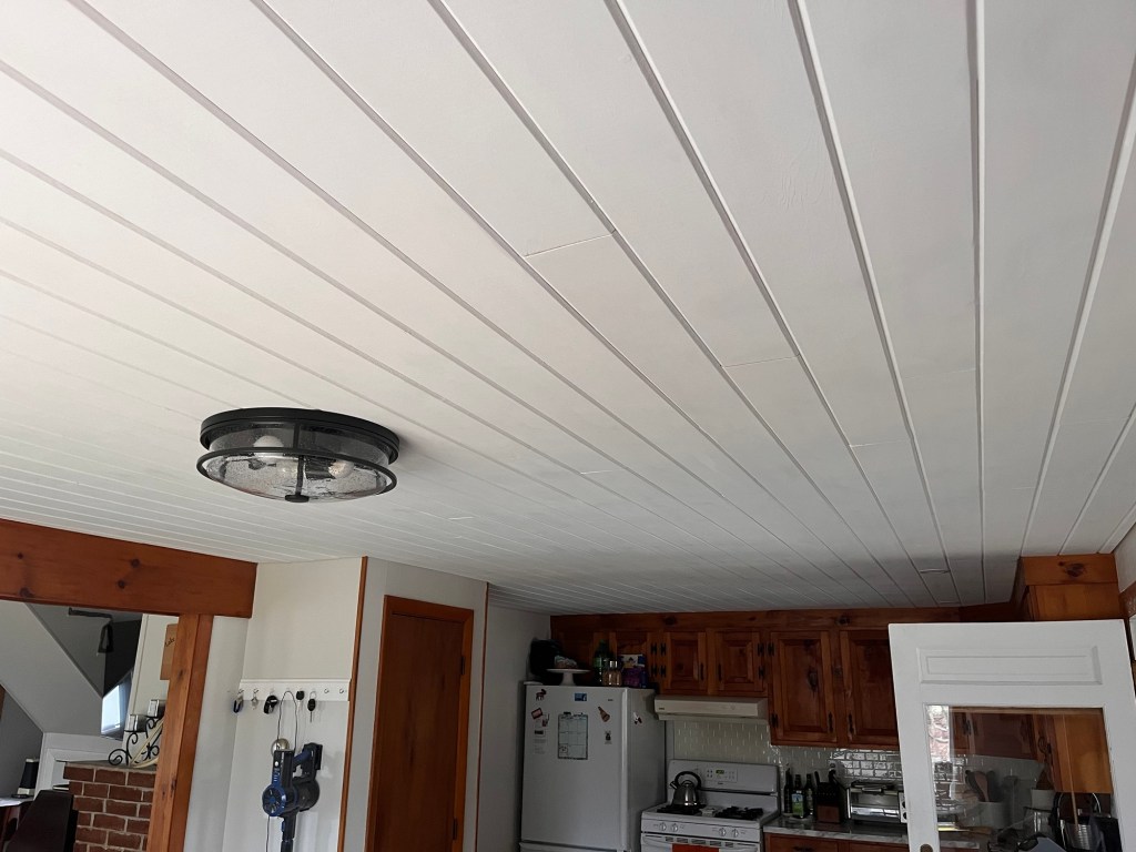 Among winter projects, the largest one was taking the pine ceiling Hubby experimented with in the bathroom to the kitchen. We still need to finish off with the moulding, but I LOVE it so much. Eventually, I’d love to carry this over to the living room to cover up the popcorn ceiling but this project is still too fresh and I believe we both need time to recover (Hubby more than me since he did the bulk of the work—-but my shoulders need some time away as well). Maybe next year. Maybe.