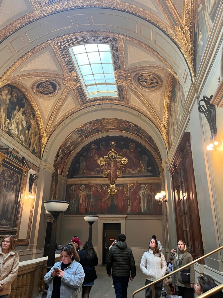 This church had amazing woodwork and this style of wood burning art throughout the church, doors, ceiling, walls. It was very unique!