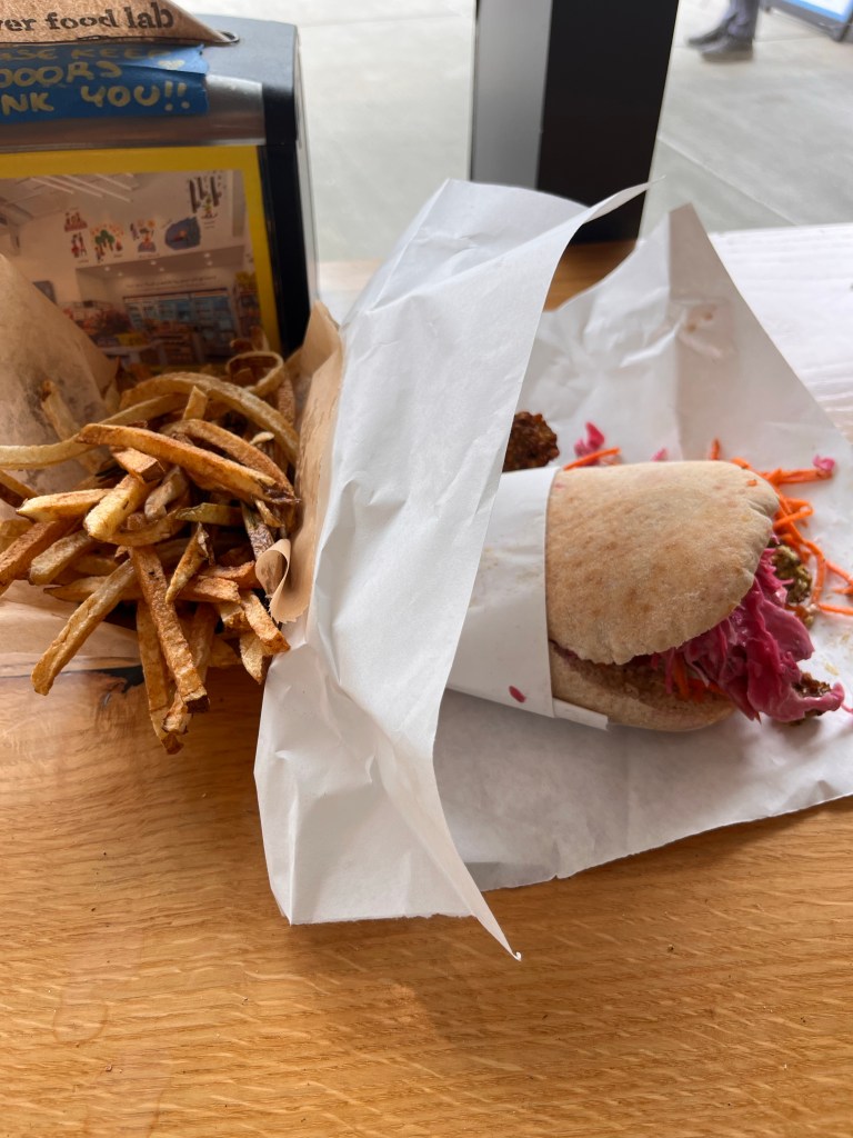 Clover’s chickpea fritter on a fresh pita and Parmesan fries. Vegan. And so good. Also, enough for 2 meals.