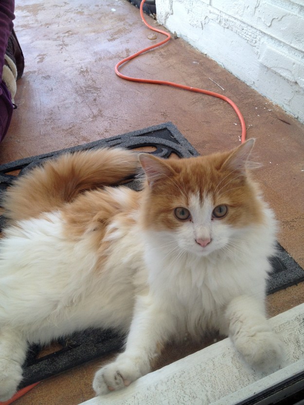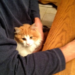 She started sneaking in the house if the door was left open. I had to pick her up one day and scoot her back out. That furry body. That swishy tail. The ginger and white coloring (in a house FULL of redheads, we notice these things…) Those big hazel eyes. Puss-in-boots. Without the boots. Then I realized she’s not a cat yet, but that kitten/cat. Dang it. She reeled me in, too. And I didn’t sneeze. Hmmmmmm. Nevertheless, I was NOT taking this kitty. Shoo. Shoo. Go home, kitty.
