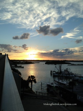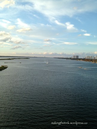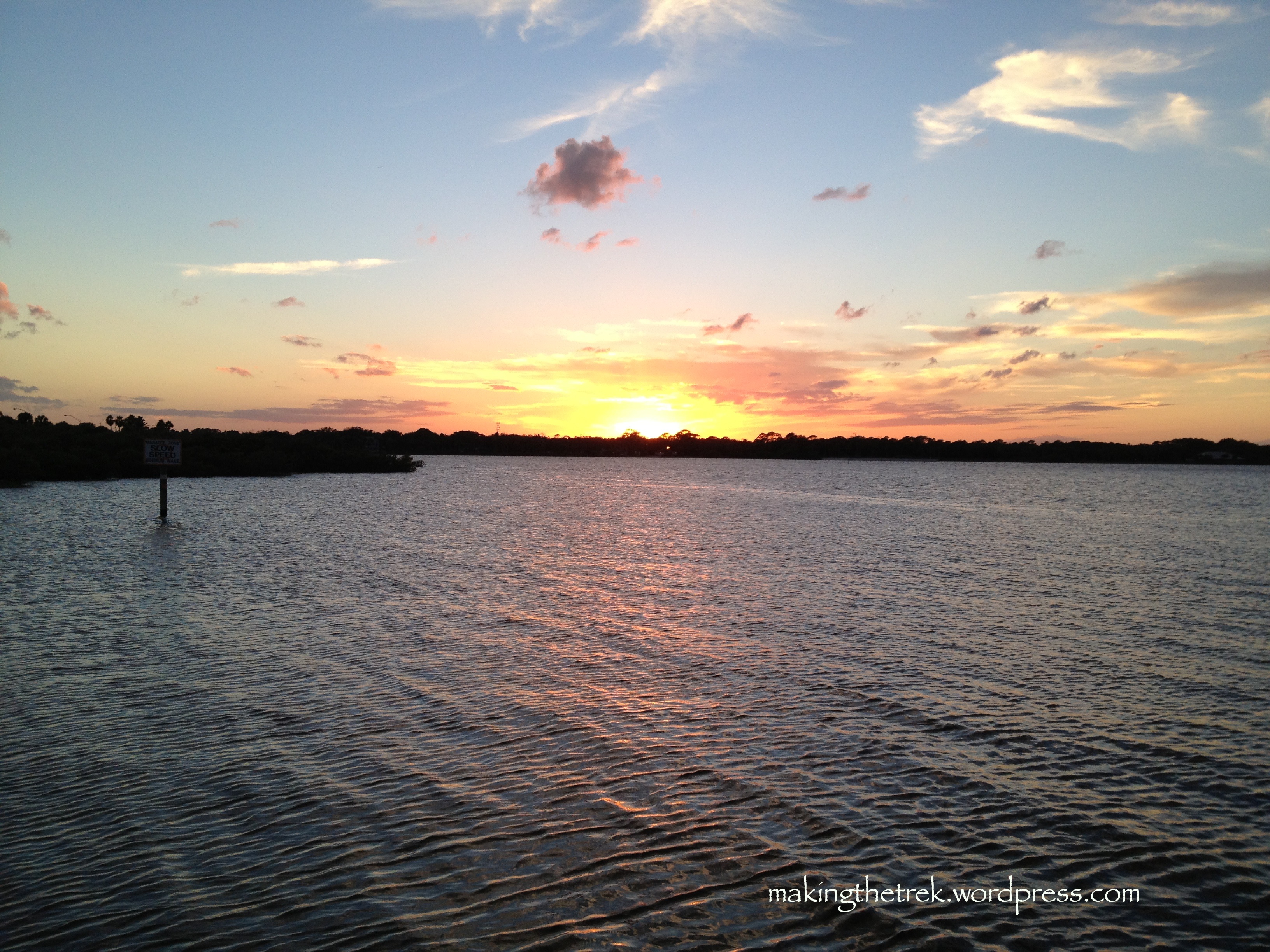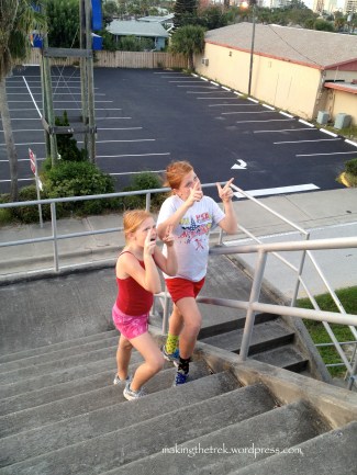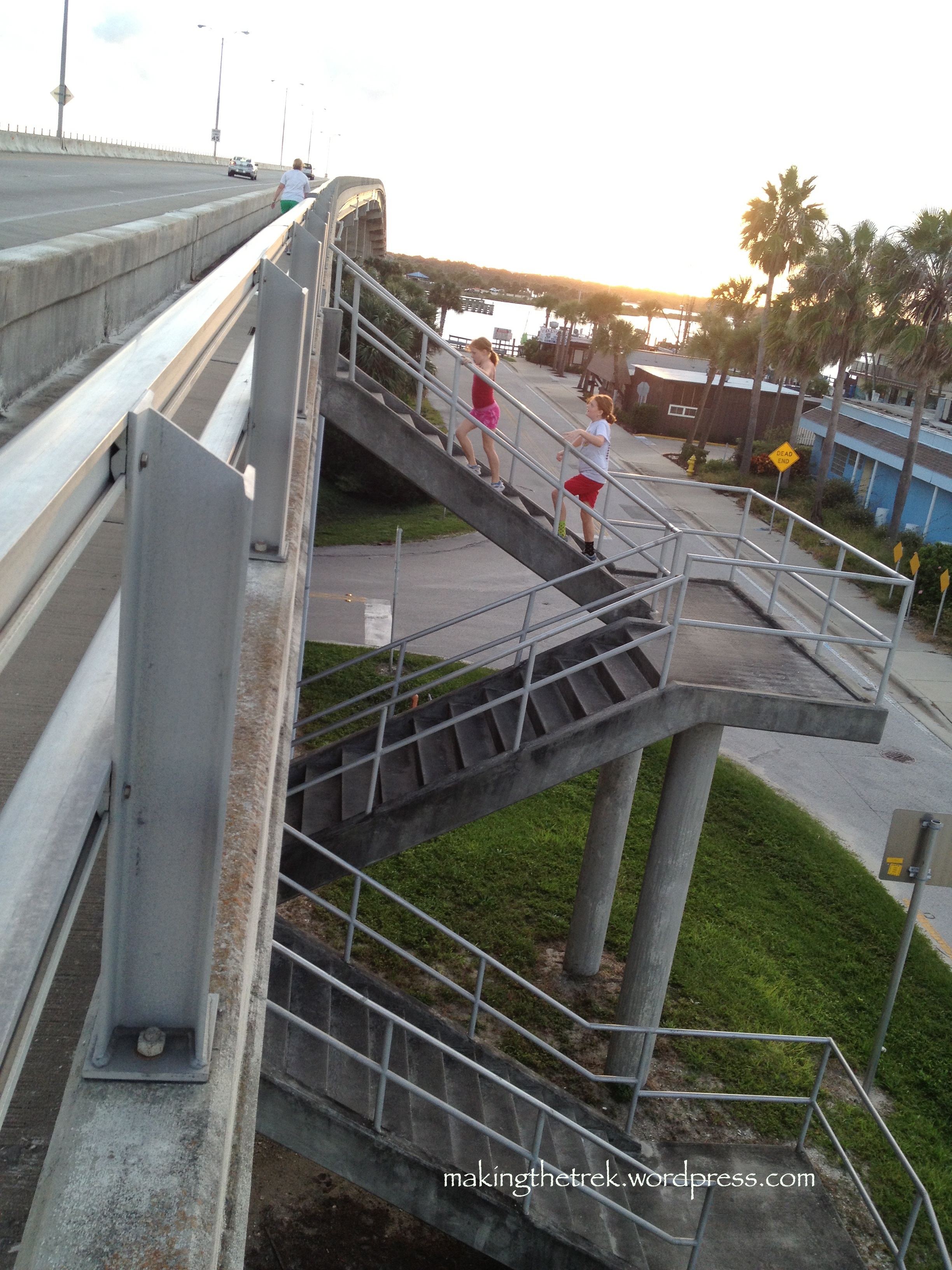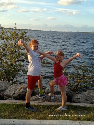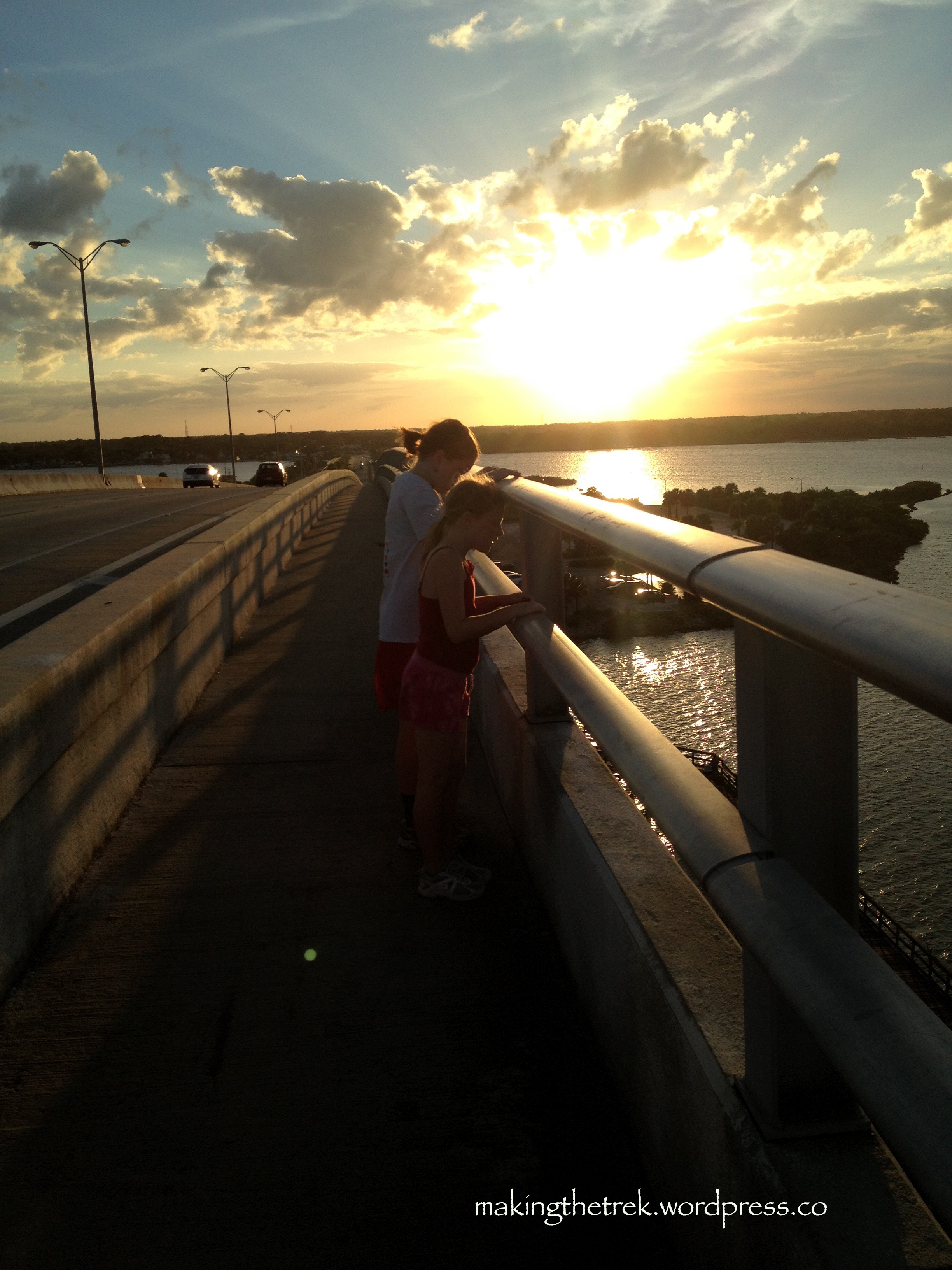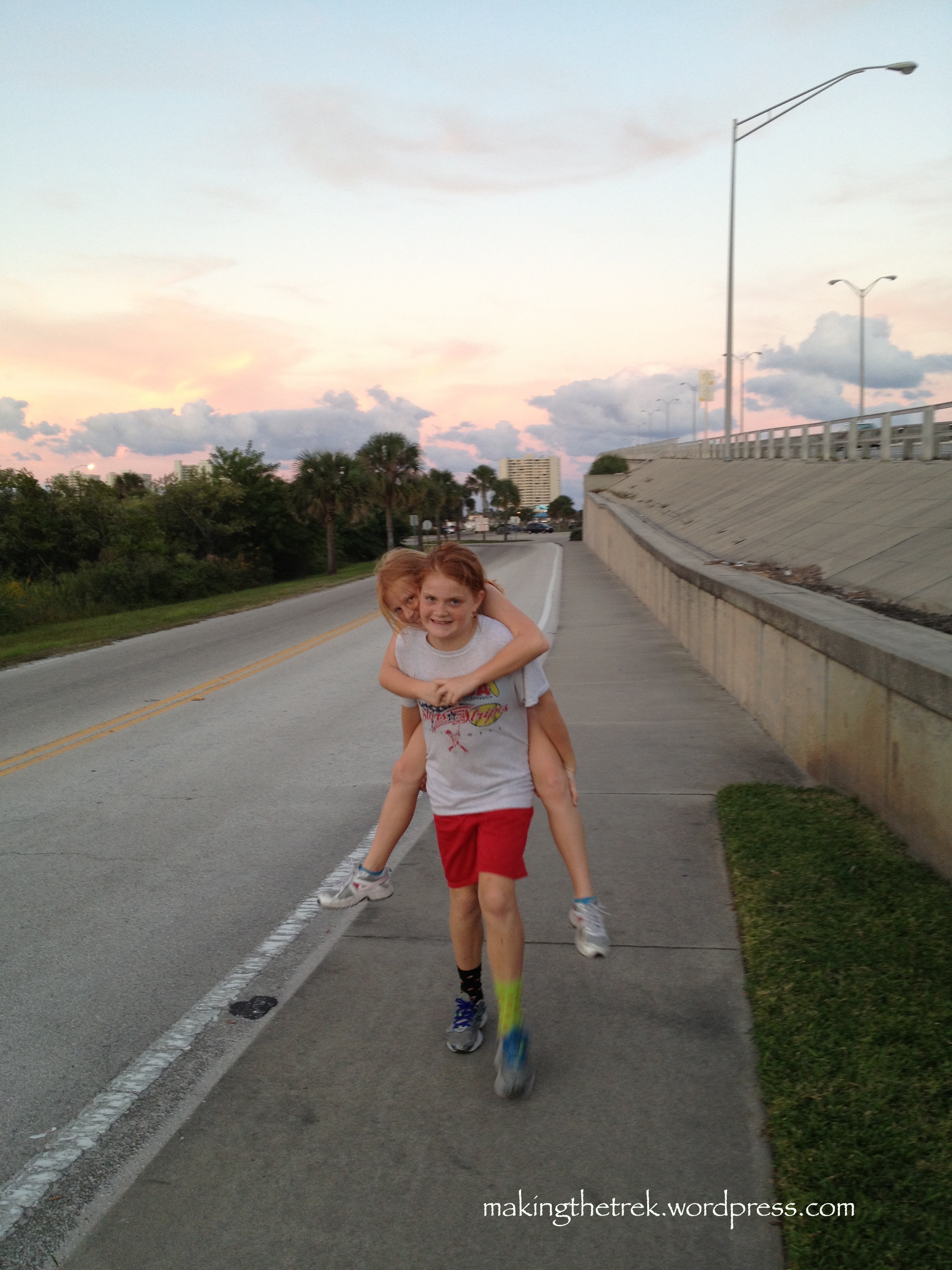 The weather is amazing…have you heard? We don’t have the lovely leaves here in the Sunshine state that y’all have a little further north, however…..we’ve got the beach and the sea breeze and shorts in October. And November. And sometimes December. If you’re our cold desensitized son, January and February are game, too. Tonight, we embraced that weather and the girls and I hit the bridge. (Dad was swimming laps and the boys were doing their own thang, including starting dinner!). It was awesome. Killed thirty minutes before dinner and burned a few cals. Perhaps even set a “healthy example” for our girls. Made it with a minimum of bickering and they finally got to spit….not from the top of the bridge…only the edge of the dock…they were happy with that. For now….
